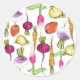 Pegatinas coloridos con ilustraciones de raíz vegetal hechos en pluma y tinta con acuarela. Las verduras incluyen remolacha, papas, rábano, zanahorias y cebollas.