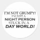 ¡No soy gruñón! ¡Solo soy una persona de noche atrapada en un mundo de día! ¿Alguna vez te sientes fuera de sintonía con el resto del mundo Ver todos nuestros diseños en tazas, tazas, camisetas, sudaderas, gorras y otros regalos y ropa.