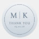 Esta pegatina de boda presenta un diseño circular minimalista con una paleta de colores gris azulado suave, creando una estética elegante y moderna. El diseño incluye las iniciales serif en negrita "M" y "K", separadas por una línea vertical, seguidas de la frase "GRACIAS" en una fuente más pequeña y coincidente, todo centrado para lograr simetría. La composición limpia enfatiza la simplicidad y la sofisticación, lo que la hace perfecta para expresar gratitud en bodas u otras ocasiones especiales. Su estilo discreto transmite un atractivo atemporal, ideal para aquellos que aprecian diseños refinados y contemporáneos.