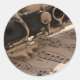 Un diseño elegante de un instrumento de viento de madera clásico clarinete contra un fondo de notación de hoja musical. Este hermoso diseño fotográfico es ideal para los amantes del clarinete y la música en todo el mundo.