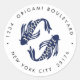 Diseñado para coincidir con nuestra colección de bodas y accesorios japoneses, este pegatina blanco redondo es perfecto para sellar sus sobres de invitación con su dirección de retorno. El diseño presenta una decoración oriental de Koi Fish en una paleta azul clásica inspirada en los colores ricos y dramáticos del arte figurativo japonés, con su dirección de retorno curvada alrededor del exterior con letras grises clásicas. Perfecto para una boda de temática asiática o de destino, boda multicultural o pareja mixta. Si lo solicita el personalizado, póngase en contacto con nosotros a través de la tienda o escriba en citronelladesign@gmail.com