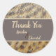 Estos stickers de bodas incluyen una foto con huellas de animales de plumas de pato femeninas. Las hermosas plumas manchadas de oro y marrón oscuro se cursan y fluyen verticalmente sobre este foco pegatina redondo. Una sólida bandera gris y tostado en el centro proporciona el fondo para los nombres de la novia y del novio y las palabras "gracias". Todo el texto se puede personalizar rápidamente.