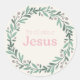 A soft, pastel Christmas sticker featuring a simple holiday wreath and the message “It’s all about Jesus”. Designed with a warm cream background, mint and deep green leaves, soft purple berries (#7F699E), and a gentle pastel pink inscription.