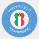 Round sticker shows an angel wearing the flag of Italy on this sticker for holiday or Hanukkah gift decorating. The Italian Flag angel is found inside a white, fractal circle of squiggly squares. The background is a blue fractal of squiggly squares. Add your own text or personalize with a name and the year. Cool stocking stuffer.