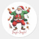 Imagen de un alegre y feliz Papá Noel, sus mejillas rosadas por el frío, sus ojos brillando de milagro. Está bailando, sus movimientos llenos de alegría y alegría, sus risas repitiendo en el fresco aire invernal. A su alrededor, algunas decoraciones navideñas - Pequeños árboles navideños están adornados con luces brillantes, sus ramas pesadas con adornos de todas las formas y tamaños. Bolas de rojos vibrantes, azules y dorados atrapan la luz, brillando y brillando. Las velas parpadean, proyectan un cálido y acogedor resplandor sobre todo. Y bajo esta encantadora escena, las palabras "Jingle Jingle" están escritas en una fuente alegre y juguetona. Es como si pudieras escuchar el jingling de las campanas de Santa, lo que añade un ambiente festivo. Espero que esta imagen les traiga tanta alegría como a mí.
