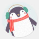 Agradables pegatinas de vacaciones con un ilustracion de un pingüino con una bufanda roja y arbustos verdes.