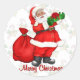 Maravilloso Navidad de arte navideño con Jolly Santa Claus. Tiene un saco de regalos de Navidades a sus pies y sostiene un regalo.