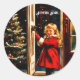 Clásico Pegatina Redondo con un encantador diseño gráfico de Navidades de inspiración vintage. Una linda niñita con abrigo rojo está parada en la puerta. Ella está sonriendo. La noche estrellada al aire libre contrasta maravillosamente con el árbol navideño festivo en el pasillo. Viene con el deseo de los Navidades franceses "Joyeux Noel" . Utilizando las herramientas versátiles de Zazzle, podrá personalizar sin esfuerzo de texto y fuentes. _________________ Diseño hecho en colaboración con Canva AI y Alma Wad la diseñadora humana .