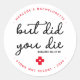 ¿Pero Muriste? ¡Kit de socorro de resaca! Estos divertidos pegatinas de soltera son perfectos para hacer sus propios kits de recuperación de resaca para sus huéspedes, esenciales si planea tener un chica a fin de semana. Visite nuestra colección para favores de soltera, favores de boda, y favores de bodas y bolsitas de boda. Personaliza con nombre y fecha. DERECHOS RESERVADOS © 2020 Judy Burrows, Black Dog Art - Todos los derechos reservados. Kit de alivio de resaca de resaca personalizada pero murió Pegatina redondo clásico