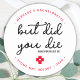 ¿Pero te moriste? Kit de alivio de resaca! Estos divertidos stickers de favor de despedida de soltera son perfectos para hacer tus propios kits de recuperación de resaca para tus invitadas, esencial si planeas tener un fin de semana de chicas fuera. Visita nuestra colección de favores de despedida de soltera, favores de boda y favores de kit de resaca y recuerdos de boda. Personaliza con nombre y fecha. DERECHOS DE AUTOR © 2020 Judy Burrows, Black Dog Art - Todos los derechos reservados. Kit de alivio de resaca Personalizado ¿Pero te moriste? Sticker redondo clásico