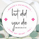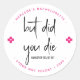 ¿Pero te moriste? Kit de alivio de resaca! Estos divertidos stickers de favor de despedida de soltera son perfectos para hacer tus propios kits de recuperación de resaca para tus invitadas, esencial si planeas tener un fin de semana de chicas fuera. Visita nuestra colección de favores de despedida de soltera, favores de boda y favores de kit de resaca y recuerdos de boda. Personaliza con nombre y fecha. DERECHOS DE AUTOR © 2020 Judy Burrows, Black Dog Art - Todos los derechos reservados. ¿Pero te moriste? Kit de alivio de resaca personalizado Pegatina redonda clásica