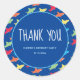 Una fiesta de cumpleaños de tiburones para niños gracias pegatina que presenta tiburones coloridos, lindos, azules, naranjas, rojos, verdes y amarillos con puntos en un fondo azul. Reciba este agradecimiento pegatina, hoy.