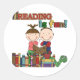 Un chico y un chica con figuras de palos, libros, un gusano de libro y un texto que dice "¡Leer es divertido!" leyendo camisetas temáticas, tazas, tarjetas, pegatinas, bolsas de té, cadenas de claves, botones, imanes, ornamentos y otros artículos grandiosos para cualquiera que ame leer y libros!