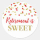 El retiro es un pegatina de etiquetas con favores dulces con un patrón de confeti rojo y oro.