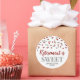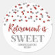 El retiro es un pegatina de etiquetas con favores dulces con un patrón de confetti rojo y plateado.