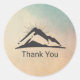 Gracias pegatinas con un estilo minimalista al aire libre. Diseñado con un ilustracion de montaña con rayos de sol que emana de atrás. El fondo es un color pergamino con un toque de azul.