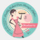 Mujer o ama de casa retro con un delantal y llevando un pastel fresco en este pegatina para una panadería o una panadería de pasteles, con su elección de combinación de colores y texto personalizado.