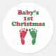 ¡Celebra a tu bebé o al bebé de un amigo con un artículo de "Primer Navidad del bebé"! El artículo incluye las palabras "Primer Navidad del bebé" en colores rojos y verdes alternados y dos huellas de bebé también rojas y verdes. ¡Hermoso!