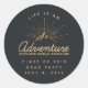 La graduación permite guardar el pegatina de fecha con un ilustracion de color dorado sobre un fondo gris negro. Diseñado con un ilustracion de montaña con los rayos de sol brillando hacia afuera desde atrás. La tipografía dice: La vida es una aventura explorando el descubrimiento de los sueños.