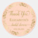 Estos hermosos pegatinas son perfectos para dar las gracias a los clientes en una ducha de novia. El diseño presenta un guión de oro elegante en un fondo de color naranja pálido o melocotón coral con un borde de encaje de Relieve metalizado falso dorado. El texto dice Gracias, con espacio para que el nombre de la novia sea y la fecha.