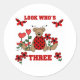 Una mariquita de oso de peluche, flores de corazón rojas y texto que dice "Mira quién es el tres" en un lindo diseño de 3er cumpleaños.