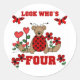 Una mariquita de oso de peluche, flores de corazón rojas y texto que dice "Mira quién es cuatro" en un lindo diseño de cuarto cumpleaños con camisetas de cuarto cumpleaños, tazas, tarjetas, pegatinas y más.