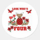 Una mariquita de oso de peluche, flores de corazón rojas y texto que dice "Mira quién tiene cuatro" en un lindo diseño de cumpleaños.