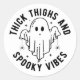 Este divertido y espeluznante diseño de Halloween incluye la frase "Thick Thighs and Spooky Vibes", distribuida en forma circular alrededor de un ilustracion fantasma clásico y bonito. El fantasma, con sus ojos simples pero expresivos, es el foco central del diseño, dándole una vibración lúdica y lúdica. De las manos del fantasma cuelgan dos pequeñas arañas, que le dan un toque de incomodidad al diseño, por lo demás, alegre. El texto es audaz y limpio, lo que crea un fuerte impacto visual y mantiene un tono lúdico. La combinación de colores blanco y negro le da al diseño un aspecto atemporal y versátil, lo que lo hace perfecto para Halloween.