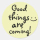Este es un lindo pegatina inspirador de citas redondas que dice '¡Están llegando cosas buenas!' impreso en lindas letras cursivas al lado de una cara sonriente. Perfecto para permanecer por todas partes y recordarte todas las cosas buenas que vienen a tu camino.