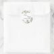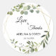 Este verde tropical deja el amor y gracias boda pegatina redondo clásico es perfecto para un simple boda. El diseño está decorado con hermosas hojas verdes pintadas a mano, adornando un marco geométrico dorado.