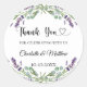 Un elegante fondo blanco decorado con flores de lavanda y vegetación de eucalipto. Personalice y agregue sus nombres y fecha de boda. Con el texto: Gracias por celebrar con nosotros.