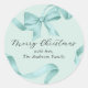 Elegantes stickers navideños con fondo azul verde claro, hermosa cinta y lazo de acuarela. Completos con el nombre de su familia y los saludos de la temporada "feliz navidad".