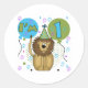 Un lindo león con una expresión tonta en su cara lleva un gorra fiesta y está rodeado de confeti y globos de cumpleaños. Diseño de primer cumpleaños del bebé.