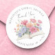 Una pegatina redonda dulce y elegante inspirada en el tema "Un nuevo capítulo comienza", perfecta para fiestas de bebé o de boda. El diseño presenta "Gracias" centrado en la parte superior en una escritura a mano, colocado encima de una ilustración de acuarela de un libro antiguo abierto. De las páginas, flores de acuarela pastel que podrían verse como rosas, peonías o guisantes dulces florecen en tonos suaves de rosa, amarillo, naranja y azul pervinca, creando un ambiente romántico, caprichoso y de cuento de hadas.