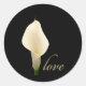 Un solo boda blanco llama a la lila contra un fondo negro dramático con amor en el tipo de letra del guión dorado. Sencillo - elegante.