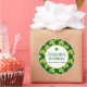 Pegatinas de cumpleaños con un lindo patrón de repetición con trébol verde oliva sobre un fondo verde oscuro. Un círculo blanco con un borde de Relieve metalizado de oro falso con el texto en el interior junto con un pequeño trébol verde.