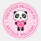 Etiquetas de libros lindas para niños con un pequeño panda de dibujos animados que sostiene un corazón rosa y texto personalizable "este libro pertenece a" y su nombre.