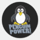 Un estilizado pegatina de pingüinos con las palabras "¡Poder Pingüino!", simbólico del sistema operativo Linux.