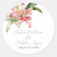 Estas etiquetas adhesivas para bodas con flores románticas presentan un simple fondo blanco con lirios rosados y blancos pintados con acuarela. Un delicado ramo de flores de lirio y follaje se muestra en la parte superior.