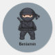 Adorable chubby yet fearsome looking little ninja is dressed in black outfit and carrying katana - traditional Japanese sword.