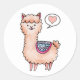 Cuidada pintura acuarela de una llama tan caprichosa con un tejido con motivos multicolores en la espalda. A la derecha hay una burbuja de habla con un lindo corazón rosado dentro.