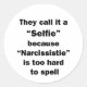 Por el amante del sarcasmo en todos nosotros. Echa un vistazo a este ingenioso diseño "Lo llaman selfie porque Narcisistie es muy difícil de deletrear" sobre prendas y regalos.