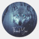 Gracias pegatinas, con la imagen de un lobo místico mágico parado en un bosque con una suave nieve cayendo por ahí. Es llamativo que los ojos azules capten tu atención.