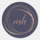 Los elegantes pegatinas monográficos presentan un logotipo de círculo abstracto en oro rosa falso, rodeando sus iniciales o monograma en escritura moderna de caligrafía sobre un fondo azul de medianoche. NOTA: NO HAY RELIEVE METALIZADO DORADO SOBRE ESTE PRODUCTO. El efecto oro rosa se crea utilizando sutiles variaciones de color que imitan el aspecto del Relieve metalizado.