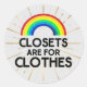 Pegatina con temática de orgullo gay presenta un gran arco iris con "los armarios son para la ropa" en negrita texto negro sobre fondo gris claro con estrella de oro