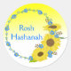 Una hoja de encantadores pegatinas de Rosh Hashanah, este diseño presenta un fondo amarillo oscuro y blanco. Hay una corona de girasol decorativa floral azul y verde. "Rosh Hashanah" está escrito dentro del gráfico. ¡Compra tu hoja de pegatinas hoy! Material gráfico creado por: AMBilustrations http://www.etsy.com/shop/AMBillustrations