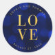 Pegatina de boda elegante con las palabras "amor" en lámina de oro falso sobre un fondo de luces bokeh azul zafiro.