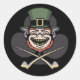 Lucky malvado leprechaun con un top-gorra verde y shillelaghs cruzados, en un fondo de shamrock. ¡Muy afortunada camisa de bebida! Patos, caramelos, regalos.