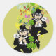 San Patricio de San Patricio Leprechaun tocando una flauta en un baile de trajes retro negro mientras toca sus instrumentos musicales en una melodía irlandesa.