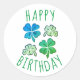 Green Lucky Shamrock Clover Happy Birthday Classic Round Pegatina. Dibujo de tres rocas de champú verdes y azules. Ropas con cuatro hojas para la suerte.